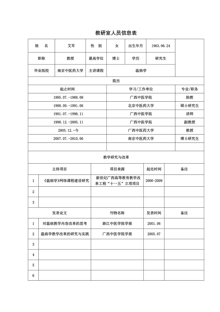 艾军,女,1963年生,医学博士,教授,主任医师,博士研究生导师,广西名中医,beat365官方网站中医临床基础学科学科带头人,中华中医药学会感染病分会名誉副主任委员,中华中医药学会名医学术思想研究分会常务委员,世界中医药学会联合会儿科专业委员会常务委员,广西中医药学会理事。