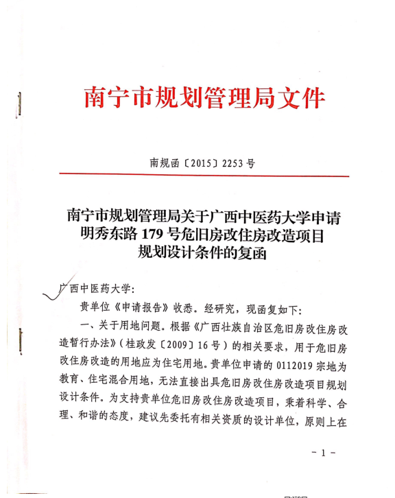 取得《南宁市规划管理局关于beat365官方网站申请明秀东路179号危旧房改住房改造项目规划设计条件的复函》 发布时间:2019-08-07 11:35:46 浏览次数: 次 【字体:小 大】 2015年10月27日,取得《南宁市规划管理局关于beat365官方网站申请明秀东路179号危旧房改住房改造项目规划设计条件的复函》(南规函〔2015〕2253号) 分享到: 【打印正文】