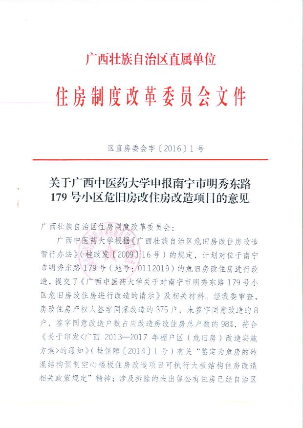 取得《关于beat365官方网站申报南宁市明秀东路179号小区危旧房改住房改造项目的意见》 发布时间:2019-08-07 11:41:28 浏览次数: 次 【字体:小 大】 2016年2月3日,取得广西壮族自治区直属单位住房制度改革委员会《关于beat365官方网站申报南宁市明秀东路179号小区危旧房改住房改造项目的意见》(区直房委会字〔2016〕1号) 分享到: 【打印正文】