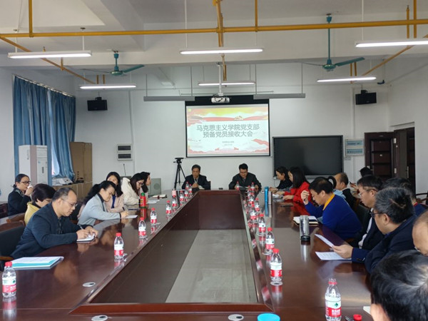 11 月 30 日下午,马克思主义学院党支部组织召开预备党员接收大会,马克思主义学院院长韦兆钧作为普通党员参加了本次支部大会。会议应到31人,实到27人。大会由支部书记李源同志主持。