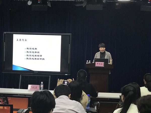 会议邀请了教育部本科教学工作水平评估专家、广西教师教育指导委员会委员、广西社会科学工作先进个人、自治区优秀教育工作者、广西高等教育研究突出贡献学者——广西科技大学罗秋兰教授作为主讲嘉宾。罗教授现场做了“教学成果奖培育与教学成果奖申报实务若干问题”的报告,围绕教学成果、教学成果奖、教学成果培育、教学成果奖申报四个方面进行了阐述,并进行现场指导。