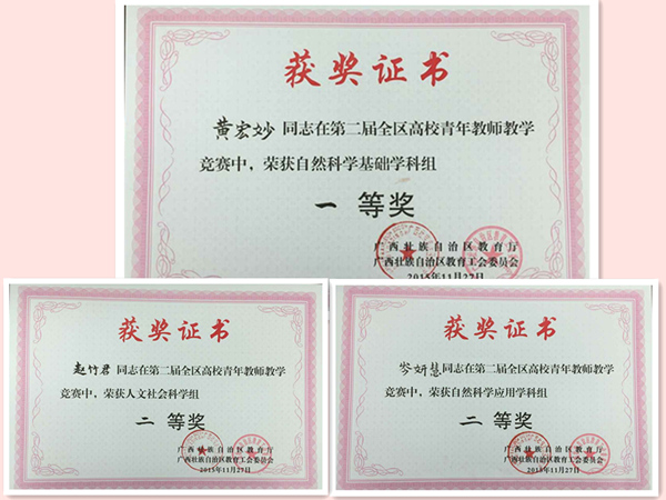 11月26日~27日,第二届全区高校青年教师教学竞赛在广西师范大学举行,来自全区32所本科院校(含独立学院)的86名青年教师参加了此次大赛。beat365药学院黄宏妙老师、基础医学院岑妍慧老师、人文社科学院赵竹君老师在竞赛中发挥稳定,赛出水平,勇夺佳绩。其中黄宏妙老师荣获自然科学基础学科组一等奖(第一名)并获准申报广西五一劳动奖章,岑妍慧老师荣获自然科学应用学科组二等奖,赵竹君老师荣获人文社会科学组二等奖。