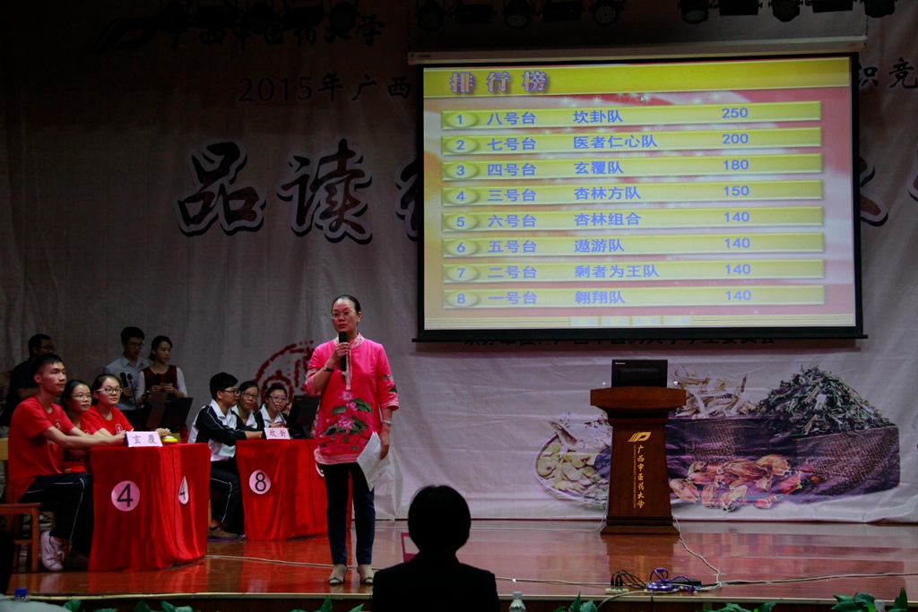 比赛由校团委主办,基础医学院协办,校学生会承办;决赛在八支参赛队伍的开场秀中拉开了帷幕。接着各参赛队伍进行了晋级赛,包括必答题以及别开生面的猜词题和抢答题,决出了前四名。再由前四名进行挑战题和风险题的比拼,一决胜负。比赛期间掌声迭起,高潮不断。观众互动环节更是把比赛推向了又一个高潮。各参赛队在友好热烈的气氛中完成了比赛。最后,依照各参赛队伍的积分进行排名,“坎卦”队以250分的高分位居榜首。评委对各队伍的表现都进行了精彩的点评,并鼓励同学们加强对中医经典知识的掌握,鼓励中医、中西医结合工作者学习和钻研中医经典,夯实中医理论基础知识,促进临床水平的提高,从而更好地发挥在临床上的骨干作用,进一步提高我院中医药队伍的整体素质。