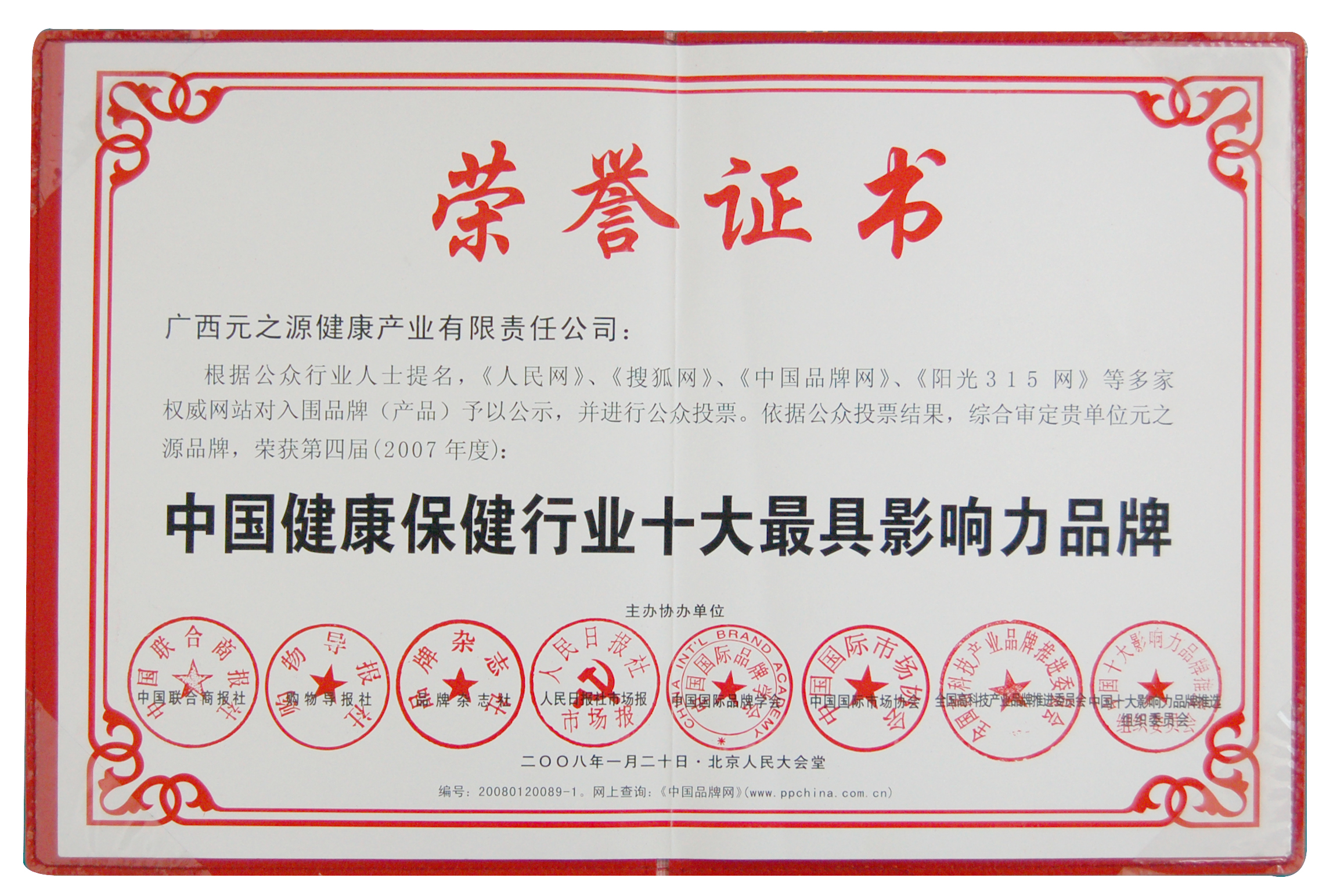 7. 元之源健康产业有限责任公司2007年荣获“中国健康保健行业十大最具影响力品牌”文件