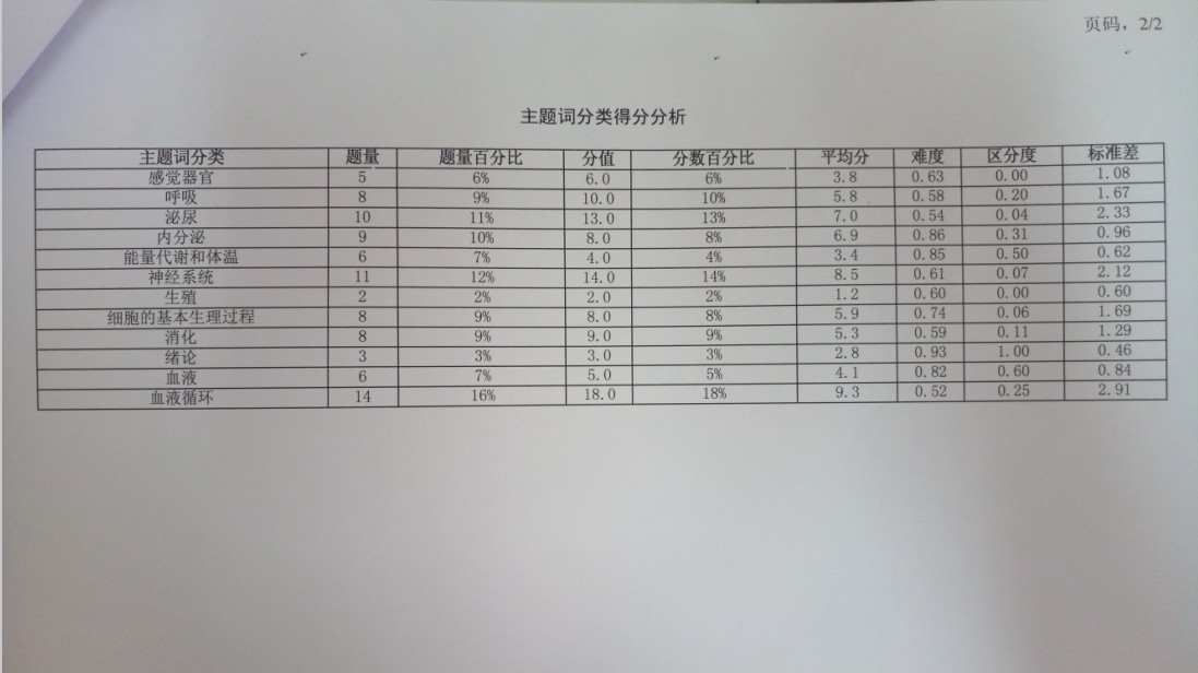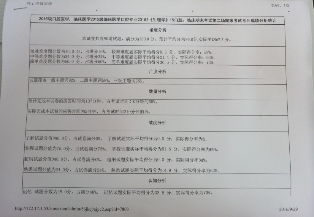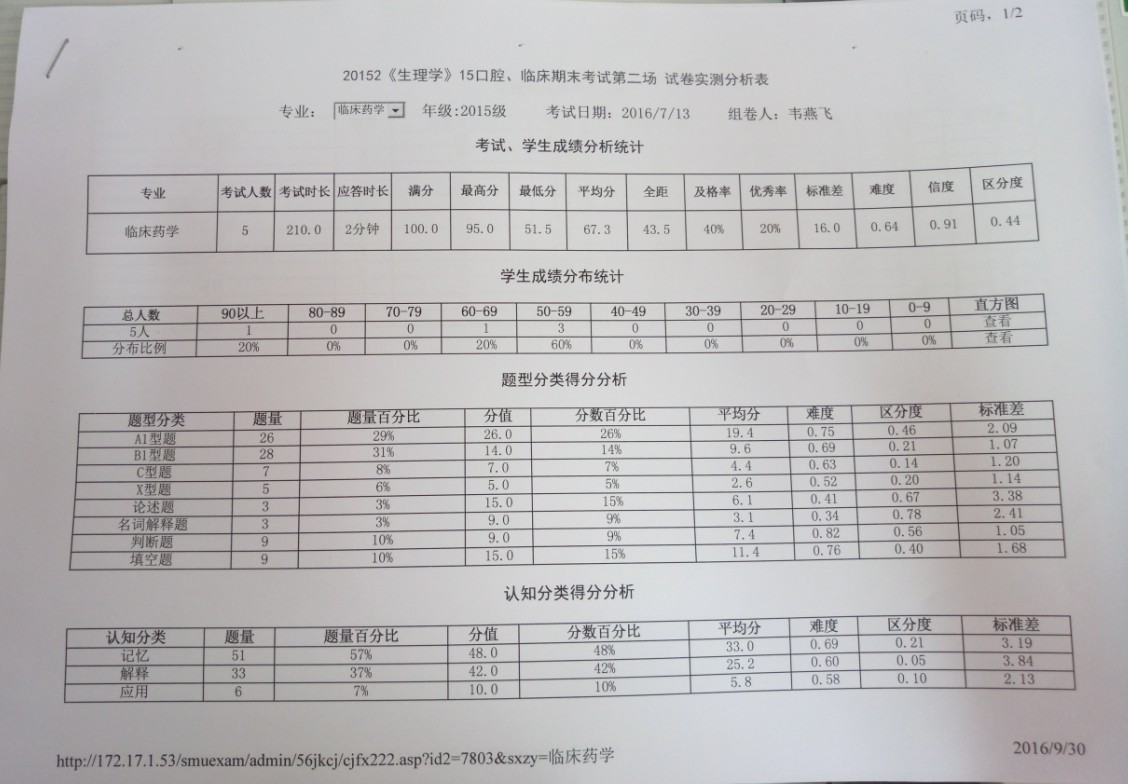 《生理学》机考成绩单与考试结果分析