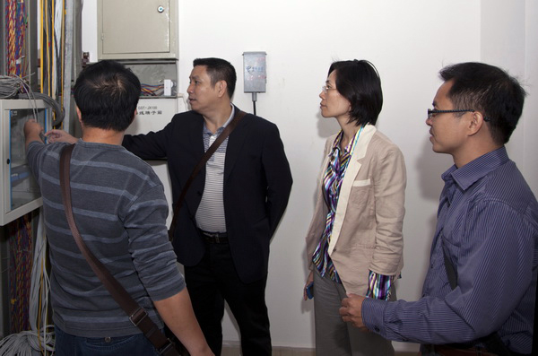 明秀校区整体搬迁(第二阶段)在即,为加快仙葫新校区校园网络工程建设,确保搬迁后的整体网络正常运行,10月24日下午,冷静副校长在学校信息网络中心主任潘家英、副主任凌泽农,基建处处长刘竑清以及校园网络建设施工方等人员的陪同下到仙葫校区图书馆大楼检查网络建设工作进展情况。