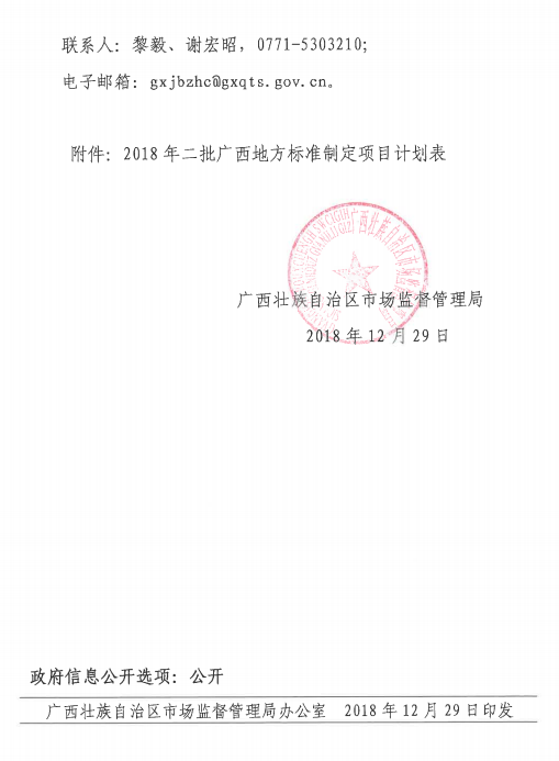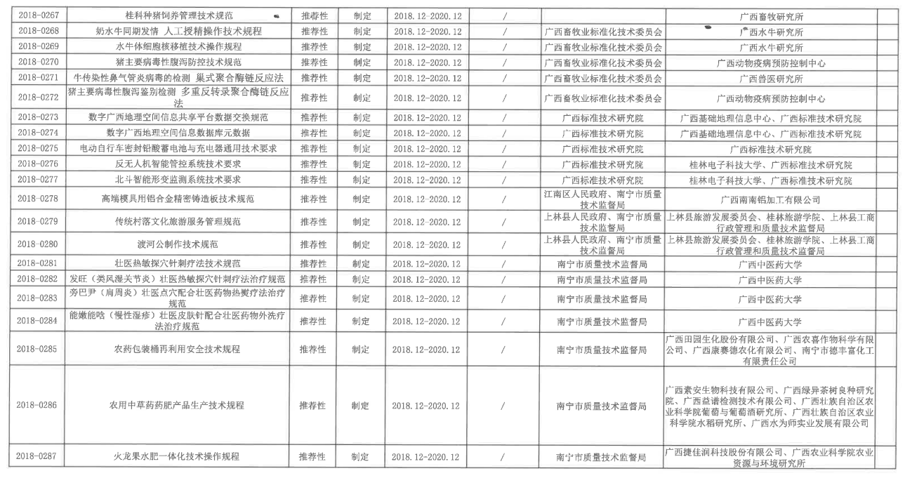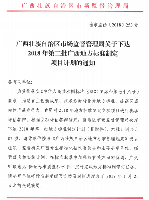 近日,根据《广西壮族自治区市场监督管理局关于下达2018年第二批广西地方标准制定项目计划的通知》(桂市监函[2018]253号)获悉,beat365有4个项目被自治区市场监督管理局立项,成为2018年第二批广西地方标准制定项目,立项名单详见表一。