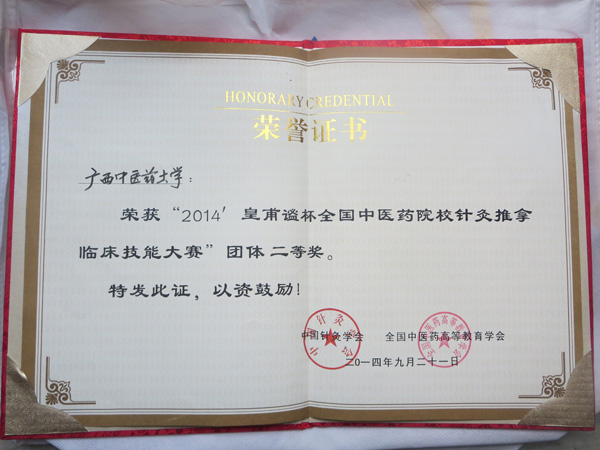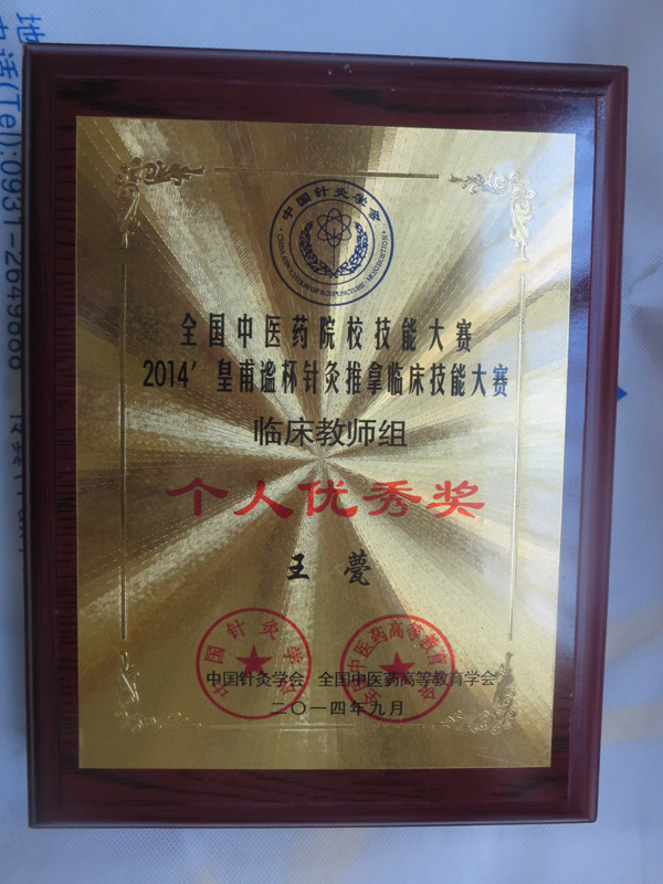 我院王甍老师代表beat365官方网站荣获2014年度“皇甫谧杯”全国中医药院校针灸推拿临床技能大赛团体二等奖及临床教师组优秀奖