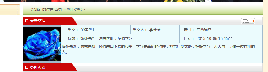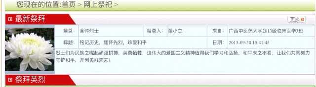 这项活动具体方式是登录广西革命烈士纪念网,在网络平台上,轻点鼠标、轻敲键盘进行网上祭奠,在网上献花、鞠躬、寄语留言。通过发表祭奠感想感言,表达对先烈、先人、先贤的感恩和敬仰。网上祭祀活动在我院各班级团支书的组织下,同学们积极参与到该活动中来。班级同学留言说,“烈士们用刚毅的身躯守护这万疆国土,您用鲜血成就了五星红旗今天的骄傲;您用一家的别离成全了千万家的团圆;继往开来,让我们来担负保家卫国的重任。”纪念烈士,这既是对鸦片战争以来为民族独立、祖国富强、人民自由幸福而前仆后继的人民英雄的永远铭记,也是对共和国历史的郑重回眸。烈士纪念日与国庆日之间的衔接,使得国庆的意义更加淳厚,欢度国庆有了深层的情愫。