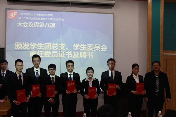 2016年11月26日上午,我院在明秀校区西梯一教室开展了以“传承、感恩、责任、跨越”为主题的瑞康临床医学院第十二届学生团总支暨第十八届学生委员会换届大会。校团委宣传部部长陈晓东老师,教务学生部主任莫启章老师,教务学生党总支书记王瑜老师,教务学生党总支副书记秦明芳老师,院团委书记、教务学生部副主任叶修廷老师、院团委副书记黄雁南老师以及新老学生会团总支成员、各二级学院团学代表参加本次大会。