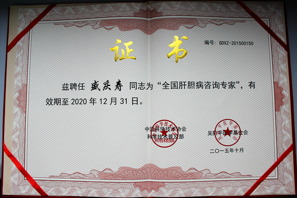 瑞康医院肝病内科主任盛庆寿博士获聘首批“全国肝胆病咨询专家”