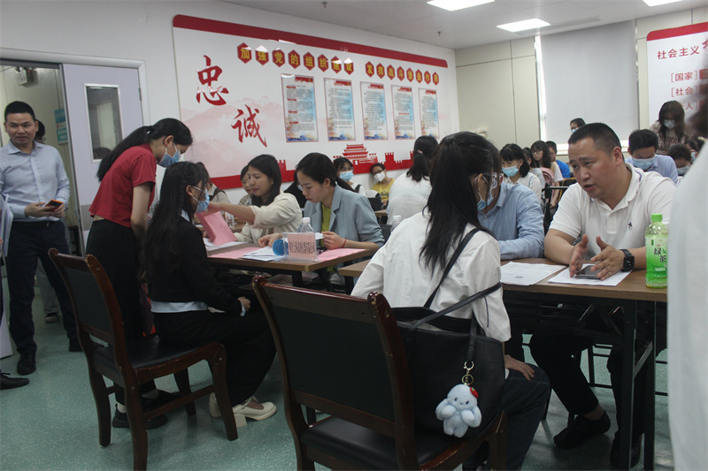 4月18日下午,我院在第二会议室举行2023届医学检验技术和医学影像技术专业专场毕业生招聘会。瑞康临床医学院检验科主任刁志宏、学生科主任王瑜、迈瑞南宁公司总经理袁智辉、北部湾创新投资公司副总经理陈章等10家企业招聘单位嘉宾出席招聘会,学生科、检验科教师,应聘和即将下点实习的医学检验技术和医学影像技术专业学生参加招聘会。
