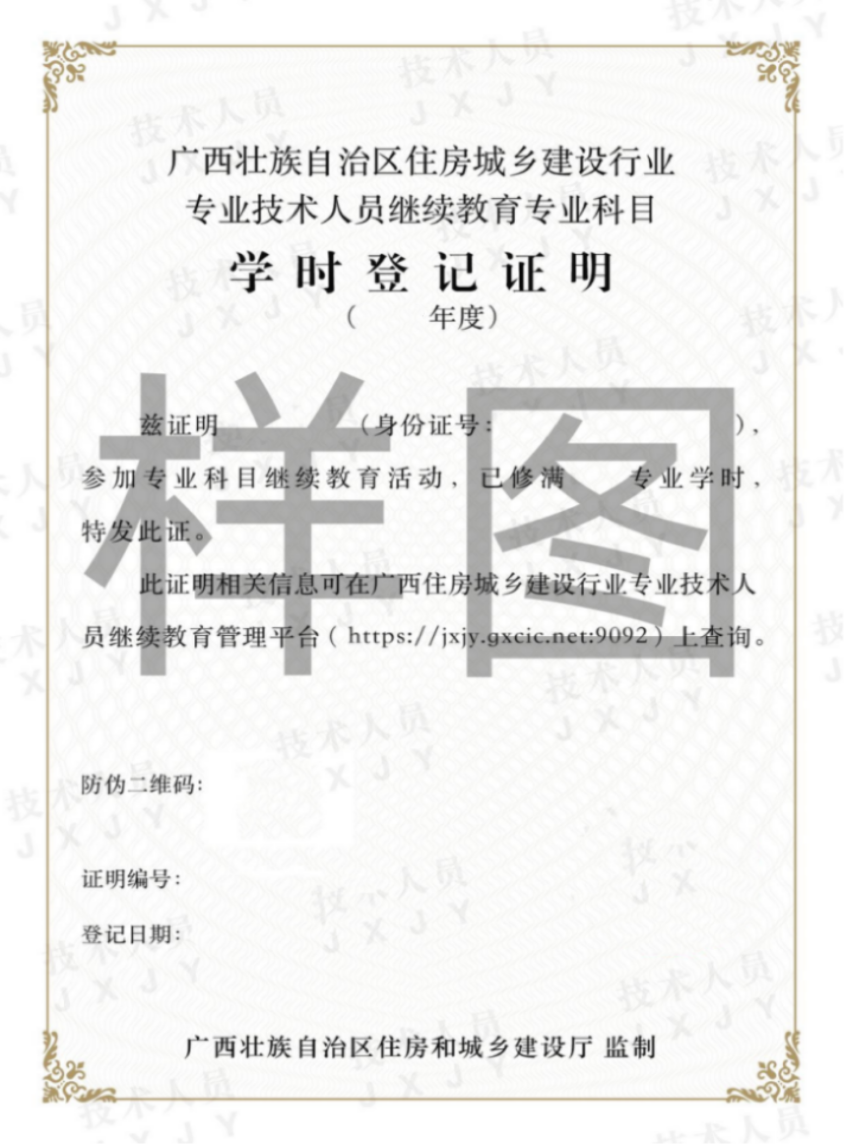 ⒌ 广西壮族自治区住房城乡建设行业专业技术人员继续教育专业科目学时登记证明