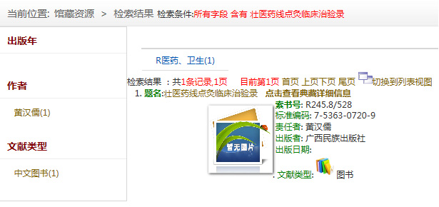 在搜索框中输入书名、作者或关键词,即可获取相关馆藏信息。以图书《壮医药线点灸临床治验录》为例,搜索后得到如下结果:
