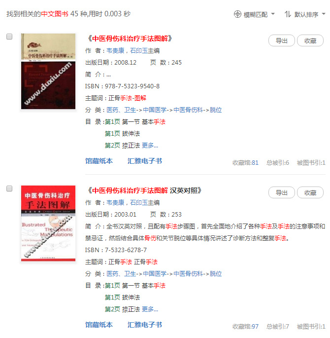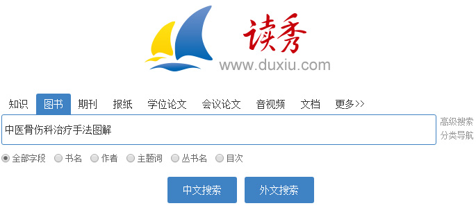 以图书《中医骨伤科治疗手法图解》为例,我们将搜索范围设定为“图书”,可以得到如下结果: