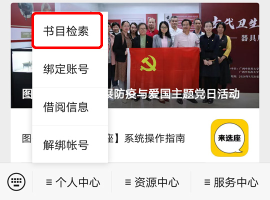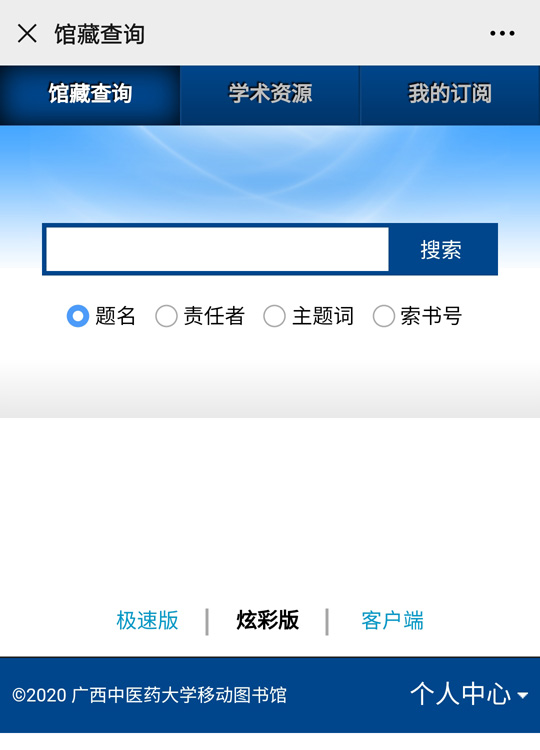 微信关注图书馆公众号(gxtcmutsg),从底端菜单【个人中心】中选择【书目检索】,即可进入查询界面: