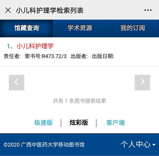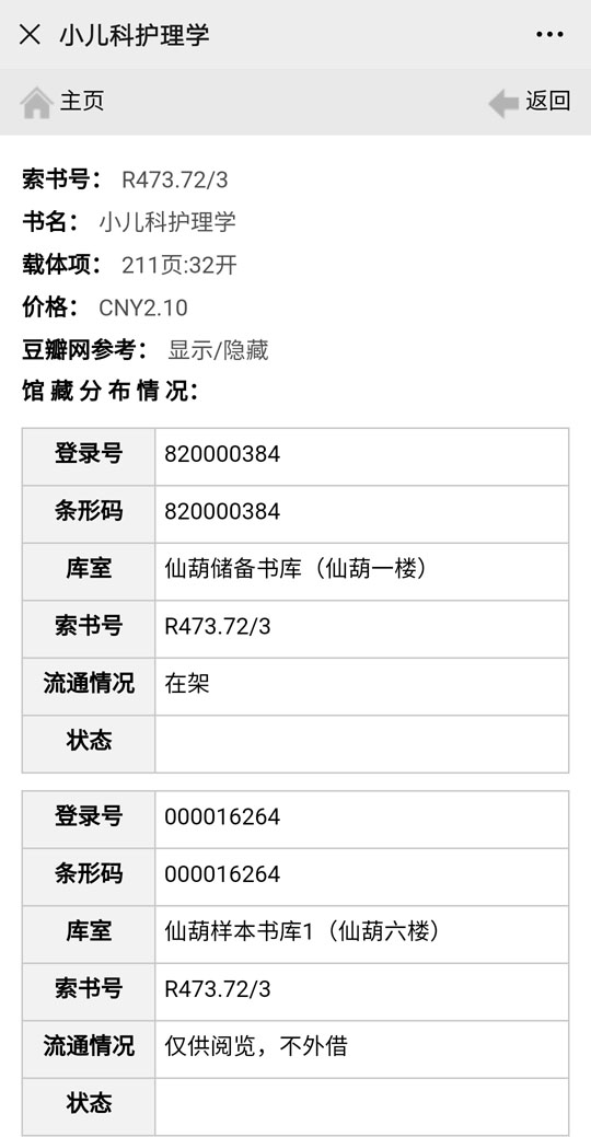 在搜索框中输入书名、作者、关键词或其他相关信息,即可得到相关图书纸质版本在图书馆的馆藏信息。以《小儿科护理学》为例,可以检索到以下馆藏信息: