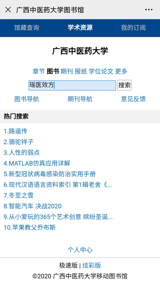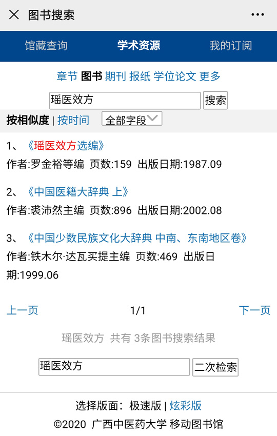 如上所示,如果选择【学术资源】,则进入图书馆移动服务的微信界面。在搜索框中输入书名、作者、关键词或其他相关信息,即可得到相关图书的电子文献信息和获取方式。以检索“瑶医效方”为例: