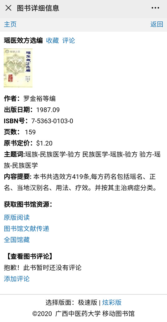 我们检索到图书《瑶医效方选编》在本馆馆藏之外的资源获取方式: