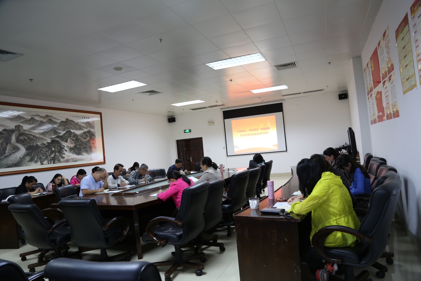 会上,蒋才武书记首先为大家上了题为《十九届四中全会精神学习讲座》,从科学制度体系、十三方面“显著优势”、总体目标、人事信息等方面进行了宣讲。同时紧扣“不忘初心、牢记使命”主题教育中对照党章党规找差距专题教育活动内容做传达。接着,三位处级领导党员依次对照《中国共产党章程》、《关于新形势下党内政治生活的若干准则》和《中国共产党纪律处分条例》逐一找差距并落实责任担当发言。随后部分普通党员也从《党章》、《准则》、《条例》要求中找出了各自的问题所在,并承诺今后加强政治理论学习,提高党性修养,改正不足之处,以实际行动践行党的初心和使命。