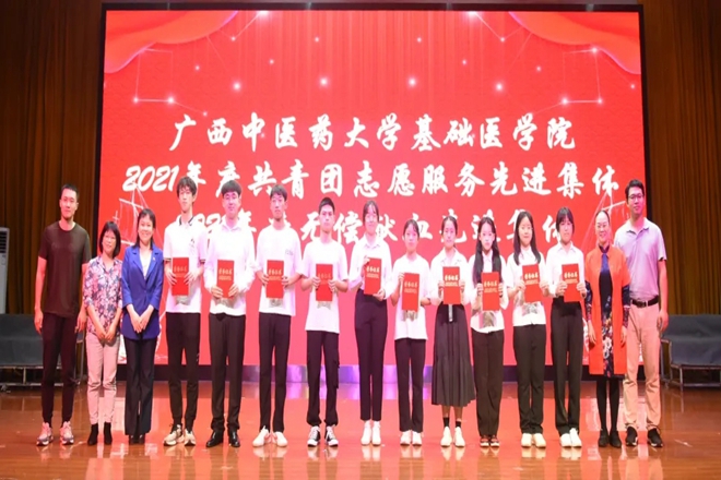 在此次晚会中还举行了beat365官方网站基础医学院表彰2021年度共青团工作先进集体、优秀个人及2021年度无偿献血先进集体和先进个人颁奖仪式,在基础学子们的共同努力下,基础医学院再次荣获2021年度五四团委称号。其中基础医学院团委志愿服务队和2020级中医学桂派杏林师承班荣获校志愿服务先进集体称号,梁紫圆等77名同学荣获校优秀共青团员称号,梁秋云等16名同学荣获校优秀共青团干部称号,吴齐俊等52名同学荣获校志愿服务先进个人称号,2020级中西医1班黄雪冰荣获校十佳团支书称号;黄德伦等五名青年教师荣获校关心共青团工作先进个人称号。除此之外,在校无偿献血先进集体和先进个人评选活动中,我院2020级中医儿科1班团支部等11个团支部荣获校无偿献血先进集体称号,杨宇帆等18名同学荣获无偿献血先进个人称号。