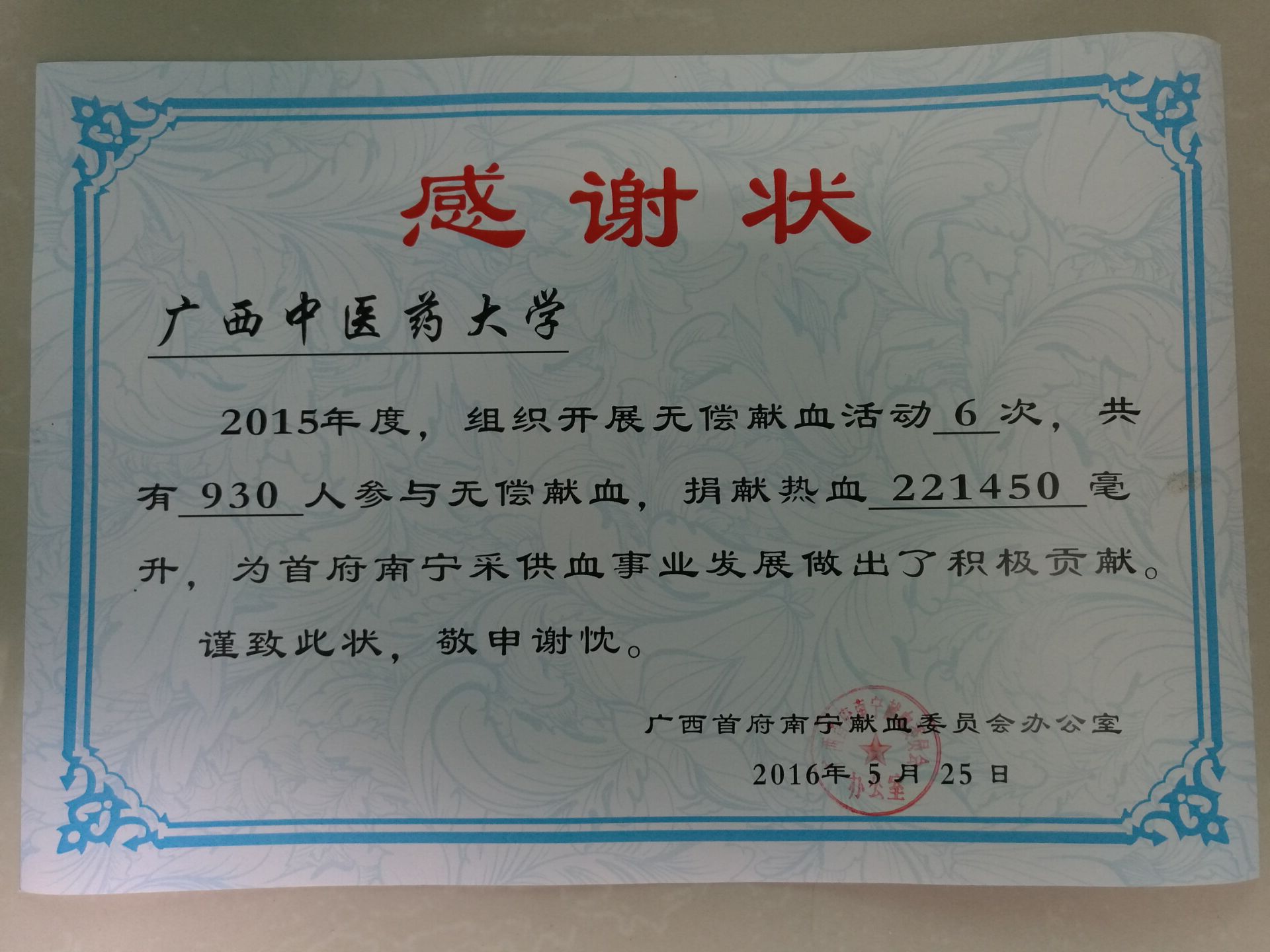 beat365荣获2015年度南宁驻邕高校无偿献血促进单位一等奖