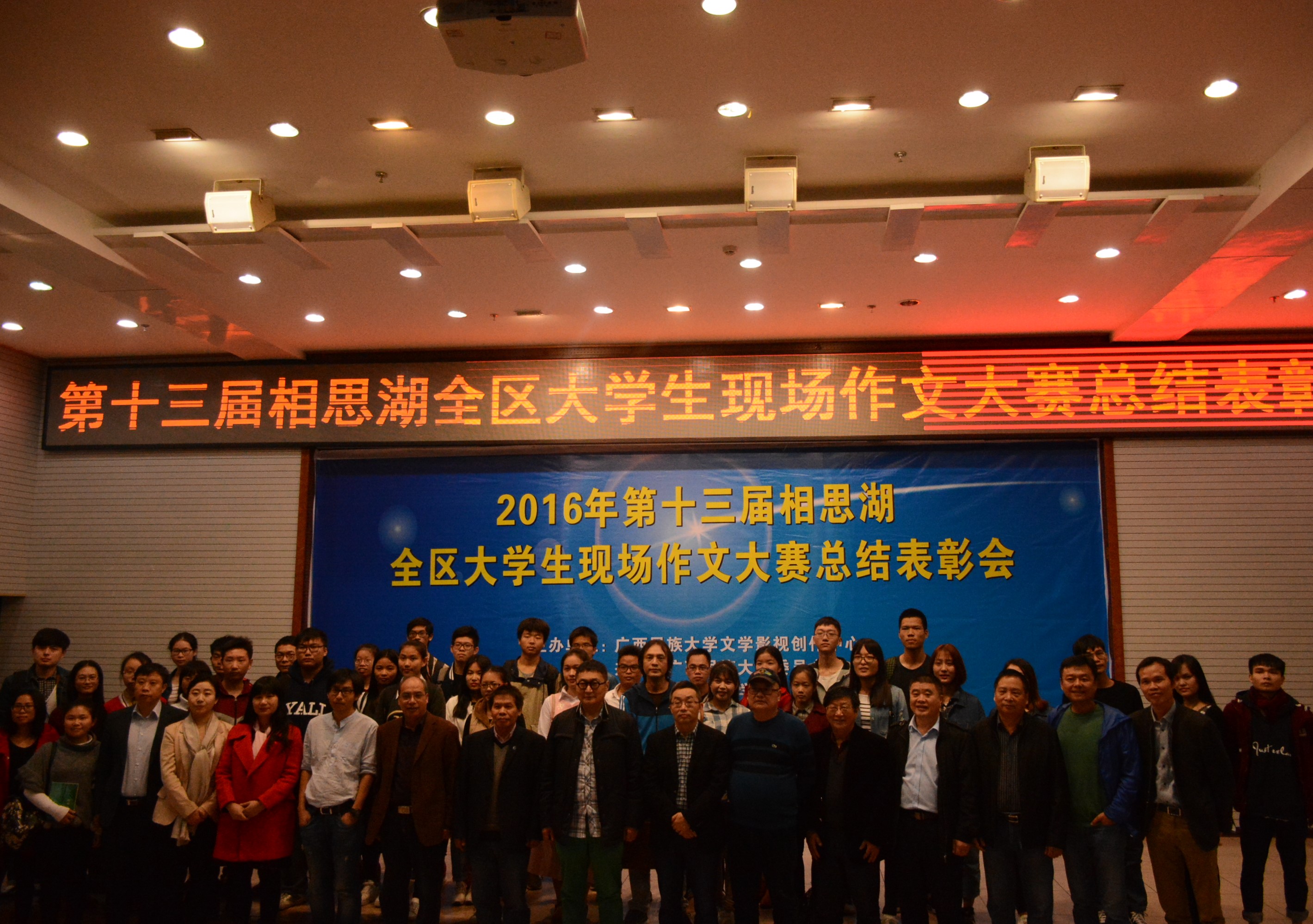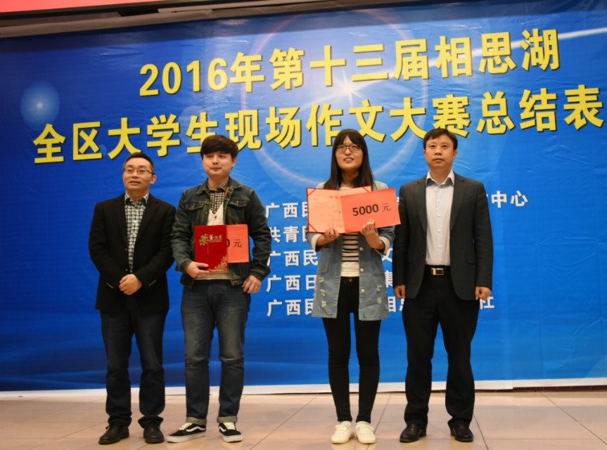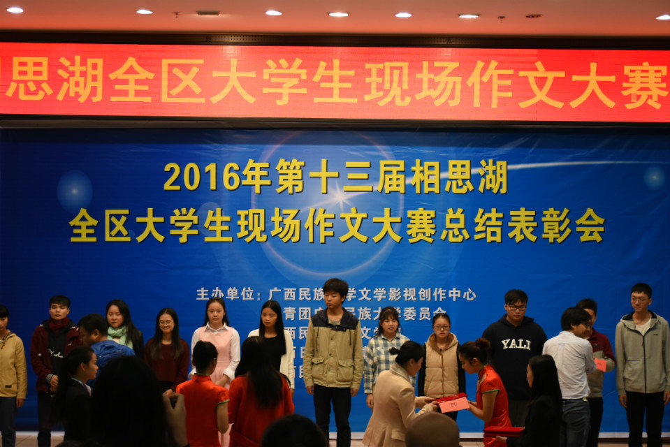 2016年12月10日,第十三届相思湖全区大学生现场作文大赛总结表彰会在广西民族大学隆重举行。beat365陈燕钦同学凭借《老三》斩获一等奖,李玉欣同学的《麦瑶与父亲》荣获三等奖,陈珊珊同学的《再也不在,不在也在》荣获优秀奖。同时,beat365大学生通讯社荣获优秀组织奖。