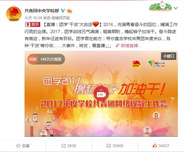 团中央学校部部长杜汇良同志作了《不忘初心 一起向前 撸起袖子加油干》的工作报告,用2、0、1、7四个数字,部署解决学校共青团2017年度重点工作。2即是2016年学校共青团改革初见成效、发展卓有成效,构成了谋划新一年工作的两大基础。0即从零出发,“强三性”“去四化”,让共青团焕发时代活力,更好地完成根本任务、政治责任和工作主线。1即以迎接、宣传、贯彻党的十九大为主线。7即是做好推进改革攻坚、落实坚持从严治团、加强思想引领、促进成长发展、加强权益服务、提升基层组织和建设“网上共青团”七项重点工作。