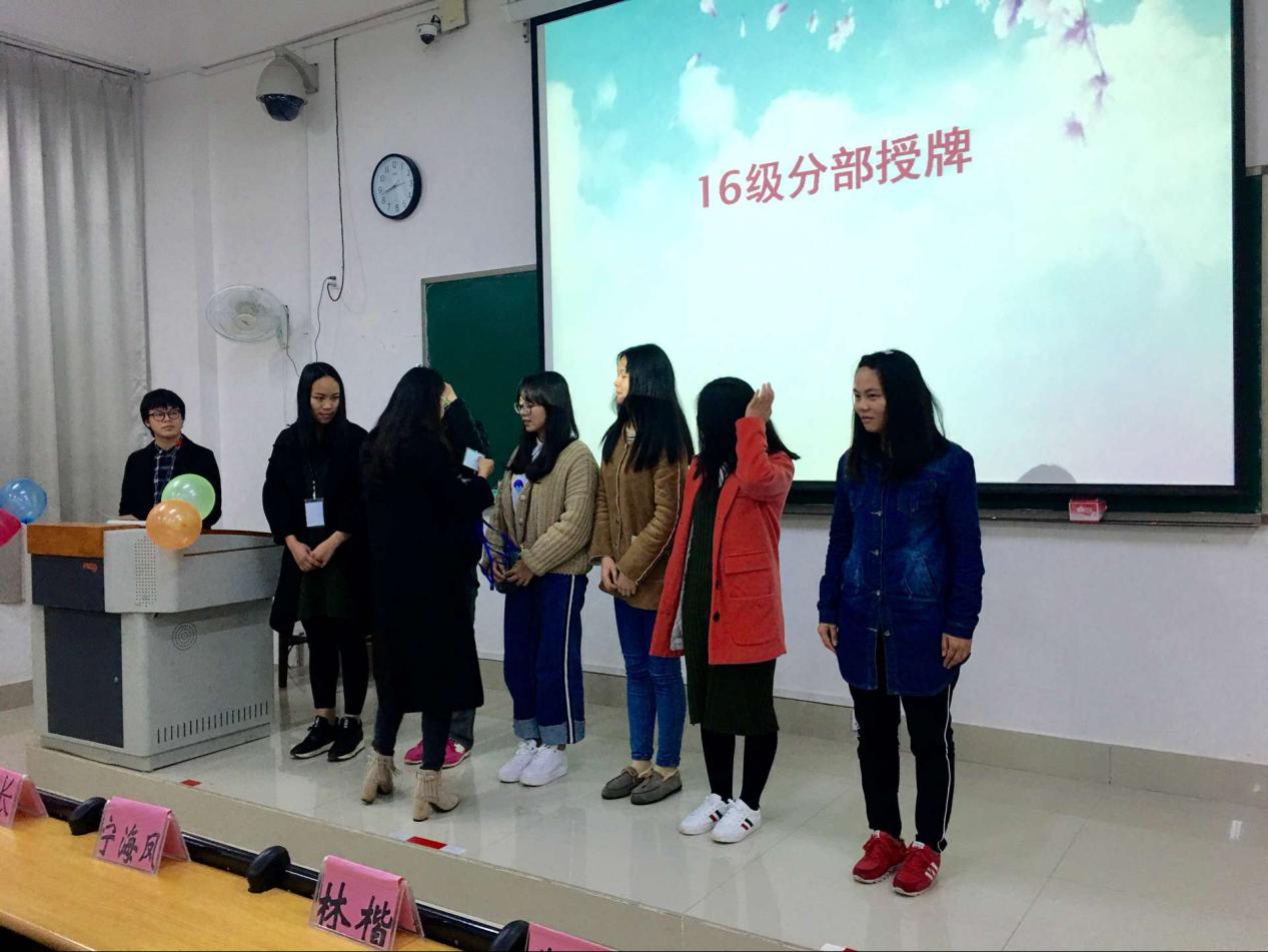 在授牌仪式中,前任社长、部长、副部长为4名新任部长、副部长授牌,整个授牌仪式在热烈的掌声中落下帷幕。