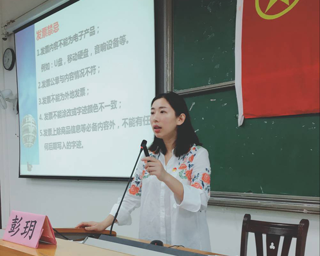 彭玥老师以“学生活动财务管理制度”为主题,根据最近财务报账出现的问题,彭玥老师向在座的学生干部们讲解了活动经费申报、冲账流程、发票禁忌,同时就各类发票报账的具体要求进行详细讲解。最后提醒各学生干部今年与往年发票报销的不同之处以及发票书写的注意事项,避免学生干部报帐出错。