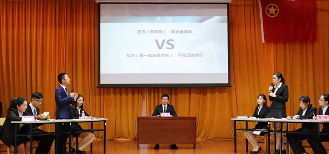 辩手们的表现十分精彩,药学院(正方)对战第一临床医学院(反方),辩题为知足者常乐,不知足者常乐。正方从知足者常乐的出处来立论。而反方却列举了许多安于现状,不思进取的种种事例来反驳。双方各持己见,不相上下。经过这一轮的角逐,反方稍稍失利,正当同学们在台下针对辩题议论纷纷时,一位辩手以迅雷不及掩耳之势,鼓动如簧般巧舌,滔滔不绝地陈说起来,一番连珠炮过后,反方过了半晌,才回过神来。对方辩手也不甘示弱,她苦思冥想,使尽浑身解数,眼珠子“骨碌”一转,猛地一站,口若悬河,妙语连珠。双方针锋相对地相持着,四周的空气似乎凝固了。台下的观众情绪高涨,各个急不可待,表情随台上的变化而变化,一会儿兴高采烈、高兴得直跺脚;一会儿屏息凝视,为辩手们捏一把汗。