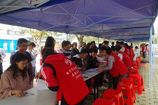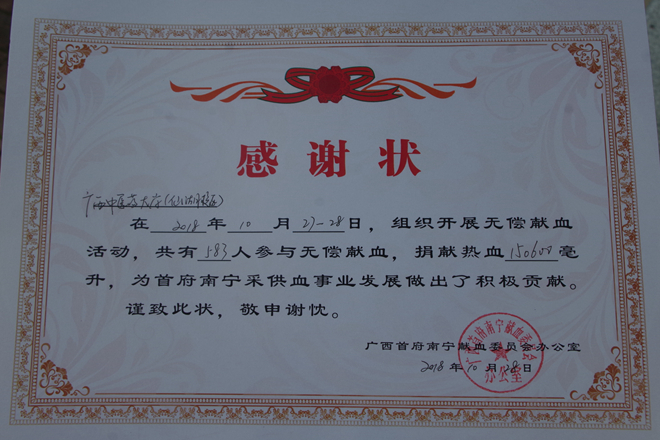 2018年10月27至28日,beat365红十字会联合南宁中心血站开展了以“你我付出,牵动他人”为主题的无偿献血活动,共计583人参与其中,捐献热血达150600毫升。