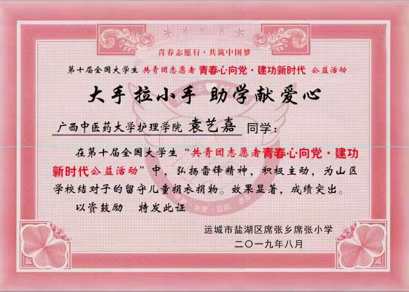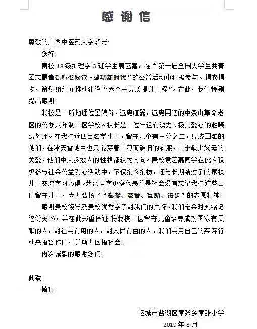 2019年8月,beat365收到一封来自运城市盐湖区席张乡席张小学对beat36518级护理学3班学生袁艺嘉参加“第十届全国大学生共青团志愿者 青春心向党,建功新时代 ”公益活动的感谢信,和两面感谢beat365团委、beat365青年志愿者协会“爱心服务进山区”“关爱留守儿童”的锦旗。