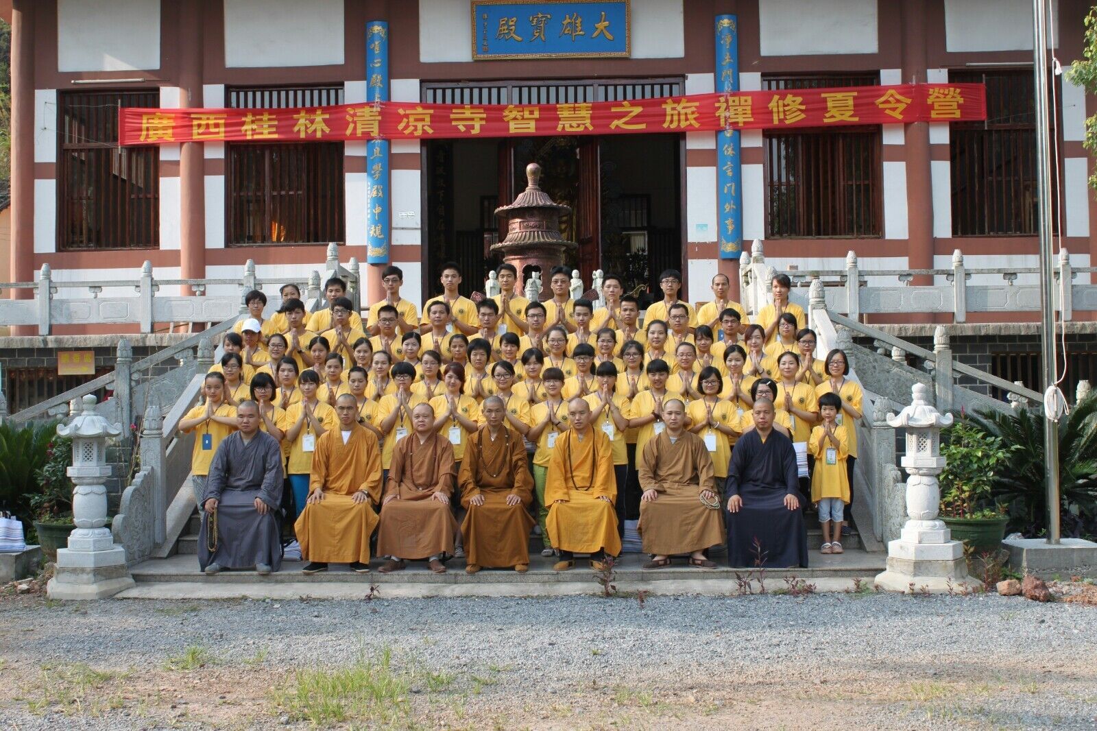 为进一步挖掘并充分发挥佛教道德思想及其价值观中的正能量,使其成为培育和践行社会主义核心价值观的强大助力,7月19日,人文社科学院的12名学生干部在院团委书记宋南老师的带领下奔赴桂林市华山清凉寺参加为期一个星期的禅修体验活动。在寺中,我们体验了坐禅、过堂、晒藏经等僧侣生活,还学习了吟诵、茶道等国学知识,更是有幸参与了传灯法会和“一期一会”的禅茶雅集活动。虽然只有短短的一个星期,却让我们感受到了佛法的高深和国学的厚重,意蕴悠远,久久不能忘怀。