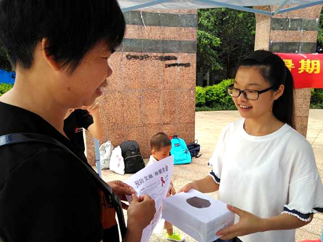 2018年7月15日上午,beat365官方网站2017级中医学二班的同学组成禁毒防艾小队在南宁市仙葫经济开发区东方广场顺利开展了暑期社会实践之“禁毒防艾进社区”活动。此次活动以“青春践行十九大,接力奋斗新时代”为主题,活动开展时,更有李晓梅老师莅临现场指导。