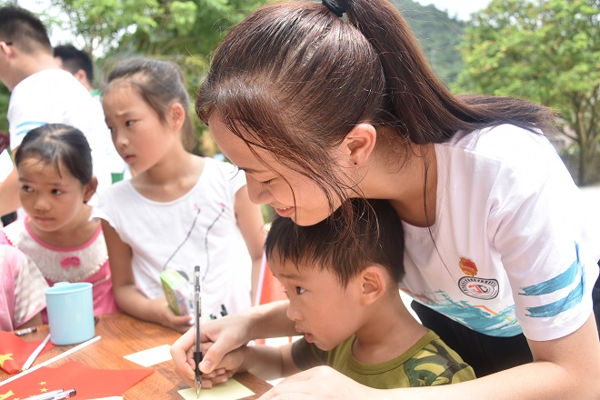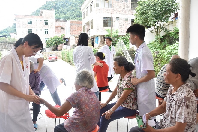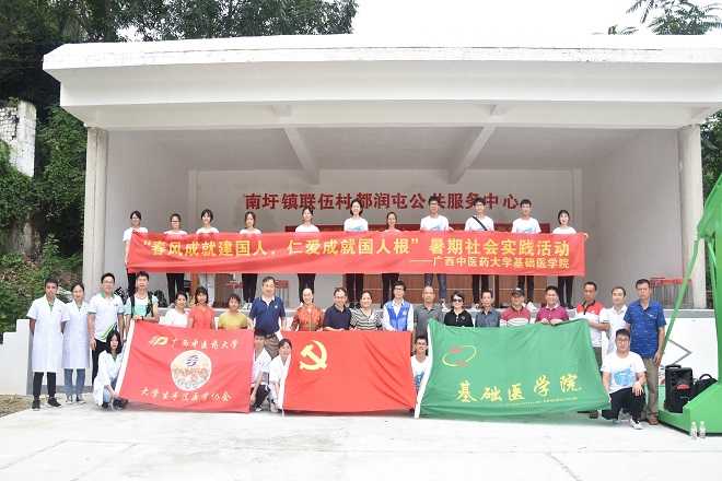 7月12日,服务队来到了广西南宁市隆安县南于镇联伍村,在那里有很多留守儿童、孤寡老人。专家医师对乡亲们进行义诊,学生们给乡亲们量血压、按摩以及给孩子们准备了各种各样的活动--纸笔传情(写下自己的愿望及梦想)、太极剑、太极拳表演、游园游戏,还给孩子们宣讲建国70周年、五四运动100周年文化,让他们感受到了社会的温情、祖国的美好。