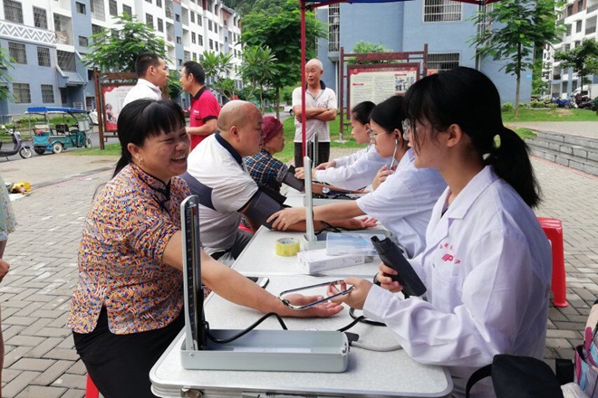 为践行“青春心向党,建功新时代”的社会实践宗旨,深入基层服务人民,2019年7月13日至14日,beat365官方网站壮医药学院“巴马爱心小分队”走进河池市巴马县六能移民新城,联合当地医院为该搬迁地社区的居民进行为期两天的免费义诊和健康咨询活动,以及了解贫困户搬迁后的生活情况。