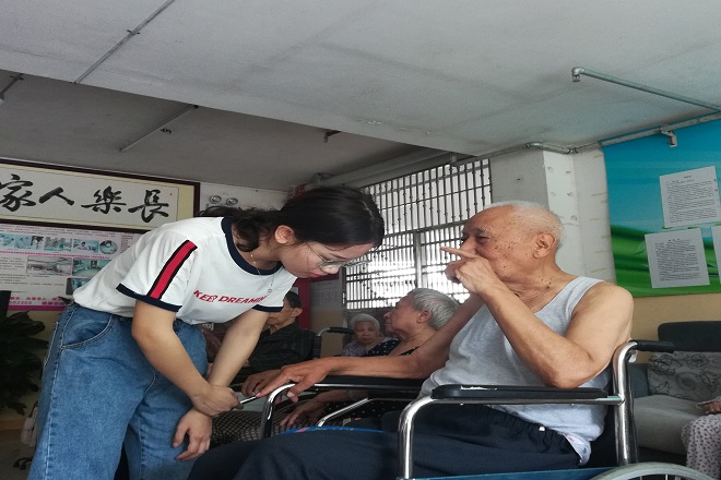7月16日,队伍全体成员带着慰问品来到金色阳光护老院,与爷爷奶奶们进行聊天、按摩等活动,带来欢声笑语; 17日—20日,不同小组成员分别为老人进行了保健活动、手指操教学、播放医学小视频、大扫除以及制作香囊赠予老人们。7月28日,队伍成员再次集体来到护老院,表演太极拳、手指操等,讲述党的光辉,医学的趣事,为老人们敲腿捶背,获得老人一致好评。