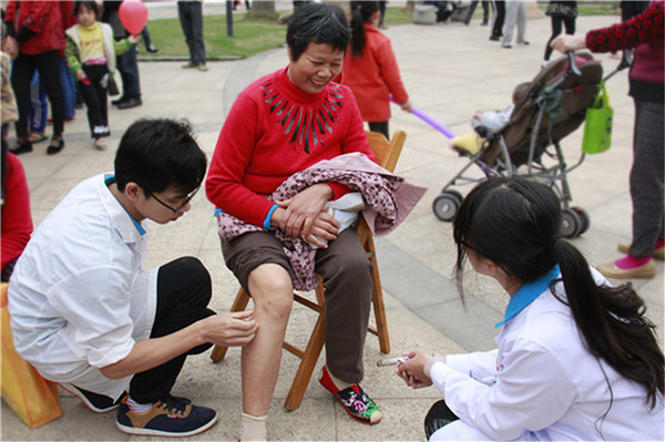 志愿者们在天池山庄广场内摆摊设点,不少过路的居民纷纷被吸引而来,不一会儿,按摩区就坐满了接受手法按摩的居民们。本次志愿服务活动包括量血压、手法推拿、针灸治疗、艾灸保健、拔罐治疗、常用急救知识培训和防艾知识宣传等服务内容。志愿者们认真地为居民测量血压,并根据测量结果仔细地告诉他们饮食作息注意事项。手法按摩组的同学运用了按、摩、推、滚、揉等手法,为居民们疏通筋骨、缓解疲劳。进行针灸治疗和拔罐治疗的同学用娴熟的动作获得了居民们的信任与肯定。负责防艾知识宣传的同学则详细地为过往居民们宣讲艾滋病预防知识,为大家揭开了HIV病毒的神秘面纱。志愿者们通过热情的态度、熟练的技艺、耐心的语言和真诚的心赢得了天池山庄居民们的感谢与赞美。居民们缓解病痛后轻松舒适的表情让志愿者们暖到了心里。
