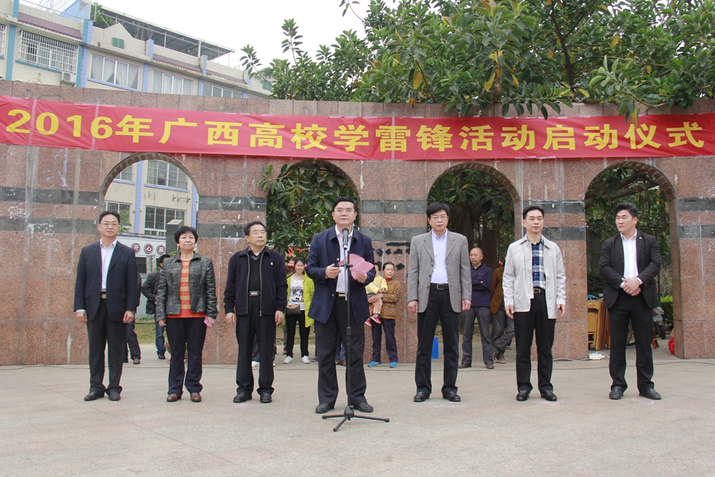 为发扬“全心全意为人民服务”的雷锋精神,践行社会主义核心价值观,3月5日上午,由自治区高校工委、教育厅主办,beat365承办的2016年广西高校学雷锋活动启动仪式在仙葫开发区管委会仙葫广场举行。出席本次启动仪式的领导有自治区高校工委副书记满昌学,beat365官方网站副校长吴琪俊,广西师范学院党委副书记叶德明,广西外国语学院副院长钟志峰,beat365官方网站赛恩斯新医药学院党委书记徐方明,青秀区政府党组成员、仙葫开发区党工委副书记、管委会常务副主任黄品贞,beat365官方网站教授陈雪斌等。各高校团委书记和600名高校志愿者参加了启动仪式。启动仪式由广西高校工委宣传部部长、教育厅思政处处长李美清主持。