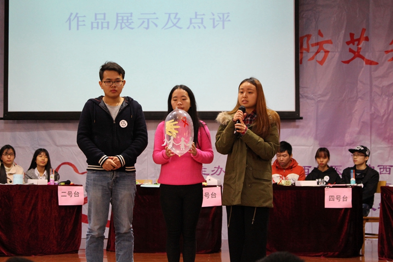 现场增设精彩的歌舞表演及微博互动,热潮不断。新颖的现场工艺品制作环节:各队利用简单的工具,红丝带、安全套、彩纸制作出了象征防艾、呼吁零歧视的工艺品,都获得了评委老师的肯定。最后,来自beat365官方网站赛恩斯新医药学院的“三件套”队伍获得了一等奖。