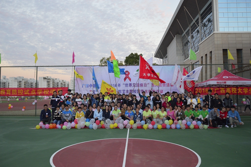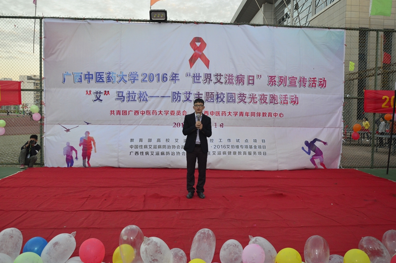 为响应国家及世界的号召,积极宣传艾滋病相关知识,让更多的人了解艾滋病,正视艾滋病人和艾滋病感染者,beat365官方网站青年同伴教育中心,以此为契机,在12月1日下午17:30展开beat365官方网站2016年“世界艾滋病日”系列宣传活动为“艾”马拉松—防艾主题校园荧光夜跑活动,以跑步传递能量,用游戏获取知识,校团委老师陈晓东老师、黄英老师出席本次活动,校内社团及班级同学近二百人参与此次活动,掀起校园一大热潮。