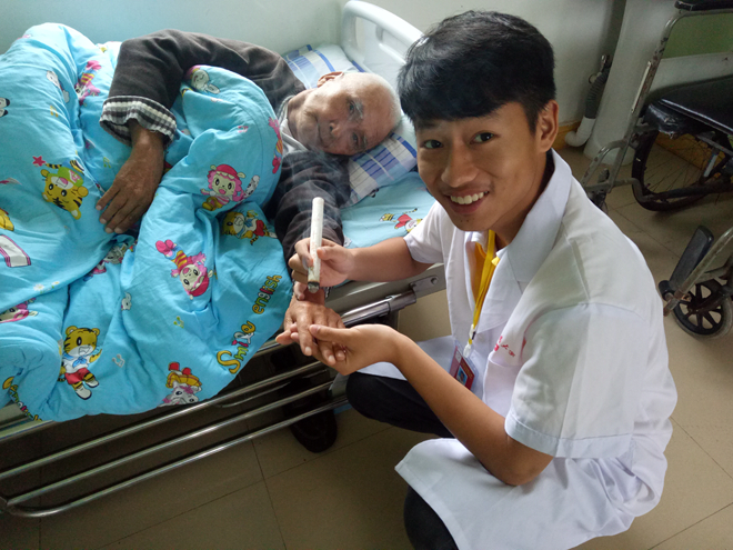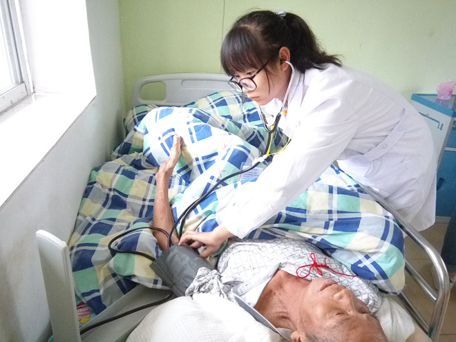 志愿者帮老人进行艾灸