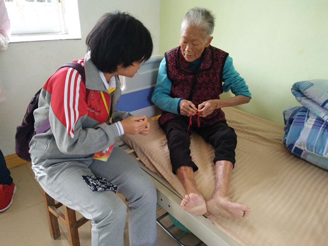 18日早上7:30,志愿者们集合,精神饱满地从仙葫校区出发。9:00,志愿者们到达曙光养老中心,敬老活动正式开始。志愿者们三俩结伴,一起去房间里探望老人。志愿者和爷爷奶奶们坐在一起聊家常,听老人们追溯当年的激情岁月。在与爷爷奶奶们聊天的过程中,志愿者们还精心为老人们缝制了手工小钱袋,做吉祥结。与此同时,义诊组也开始为爷爷奶奶们量血压、艾灸,帮助老人温通经脉、疏风散寒。在活动最后,志愿者们为老人演唱了歌曲《我的祖国》,唱到兴起时,老人不禁随着歌声打拍子,和起音。院子里传出阵阵歌声,气氛祥和。