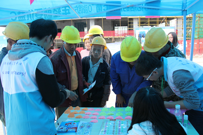 由大学生红十字会的成员向工人们进行急救演示、普及急救知识,由青年同伴教育中心的成员给前来参与活动的工人们分发放预防艾滋病知识传单和宣讲预防艾滋病的知识。为了提高工人们参与度与积极性,志愿者们还开展了一些趣味性活动,给工人们发放一些小奖品。