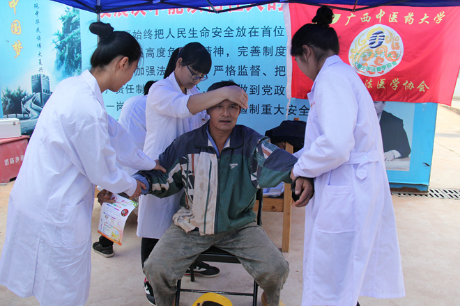 2017年11月19日上午,由beat365团委、校学生会、大学生社团联合会的部分成员及大学生手法医学协会、青年同伴教育中心、大学生红十字会的部分成员组成的爱心团队一行65人进入邕宁区香醍半岛威宁·邻家龙岗东广场的工地开展以“践行医道精神,让爱与健康同行”为主题的义诊活动,号召工人们关心自己的身体健康,并向工人们展示中医药文化独特的风采。