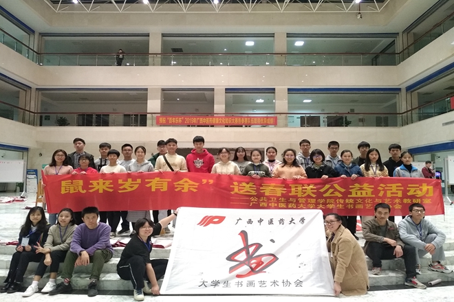 2019年12月6日-7日,公共卫生与管理学院传统文化与艺术教研室与beat365官方网站大学生书画艺术协会共同开展的迎新春送春联活动在beat365仙葫校区图书馆二楼举行。beat365大学生书画艺术协会指导老师李建光老师、校组织部部长唐振宇老师、校直属党委副书记覃振林老师、校党委徐方明主任、校团委杨删书记和陈晓东老师、百年乐制药厂励庆顺老师共同参与本次活动。