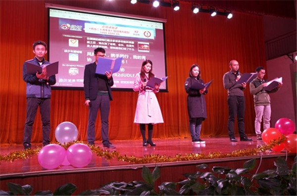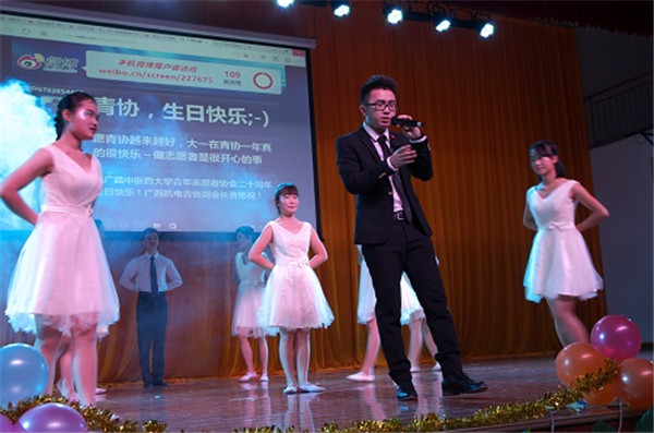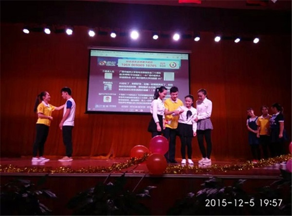 伴随着观众热情的欢呼声,广西高校志愿者联谊晚会暨beat365官方网站青年志愿者协会成立20周年晚会在时尚与环保相结合的开场秀——《环保时装秀》中拉开了序幕。在老师及青协现任负责人的发言后,晚会正式开始了。青协各前任会长们将对青协的深情融入到《最美的时光遇到你——青协》中,表达了志愿者对青协的爱与依恋;青协的志愿者们通过表演小品《一家人》来呼吁大家一起加入关爱老人的队伍中;吴睿老师演唱了《夜空中最亮的星》,借以为路人指明道路的明星来比喻永恒不变的志愿服务精神,并赞美了志愿者的无私奉献;《爱留下,守护他》在表演者的精彩演绎下,体现了关爱留守儿童这一深刻主题;其他由校内外各兄弟社团表演的节目,也展示了当代大学生的青春与活力。真正掀起晚会高潮的是纪念青协成立20周年生日蛋糕的出现,大家不约而同地高唱生日快乐歌,为青协送上最诚挚的祝福。最后,在全体合唱会歌《爱就在身边》的歌声中,此次晚会圆满地落下了帷幕。