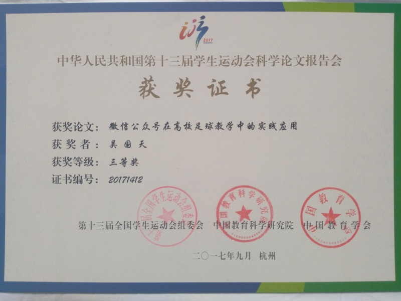 近日,由教育部、国家体育总局、共青团中央主办,浙江省人民政府承办,中国教育科学研究院、中国教育学会全国高等学校体育教学指导委员会、全国中小学体育教学指导委员会协办的第十三届全国学生运动会科学论文报告会在浙江工商大学举行。beat365体育部韦东谊老师报送的论文《2010年-2014年广西城市汉族男生7-22岁学生体质状况比较研究》紧跟学生体质健康的热点问题,数据全面,分析到位,观点独特;吴国天老师报送的论文《微信公众号在高校足球教学中的实践应用》紧抓校园足球和互联网+当前这一最热门的学校体育研究课题,有理论分析,有实践应用,两位老师同获三等奖,beat365论文获奖数量名列广西高校第二位。