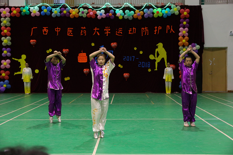 仙葫玉兰十里香,体育馆内人心扬。2018年5月31日晚,beat365官方网站运动防护队在beat365仙葫校区体育馆一楼举行一周年庆典,体育部李荣源主任、学工处赵静老师、药学院团委书记黄鑫老师、校瑜伽队指导老师覃月泉老师、体育部王庆博老师、体育部王惟钊老师、运动防护队指导老师冯强老师,莅临现场观看了庆典。
